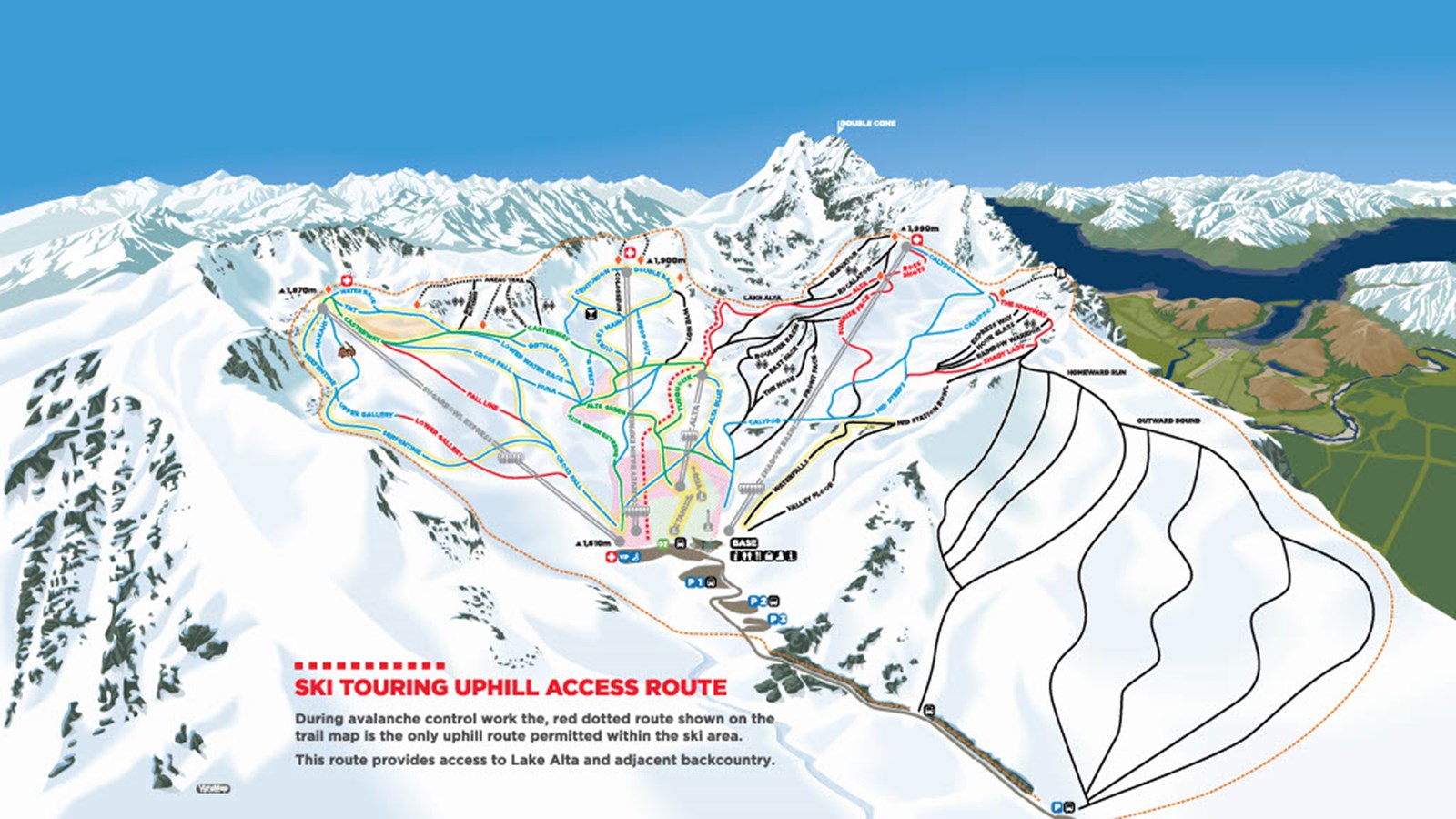 - The Avalanche Control Safe Route terminates at Lake Alta. Access to the north side of the lake and the Alta Chutes area is closed (which may be indicated by a sign) - access to the backcountry must be via the south side of the lake.
