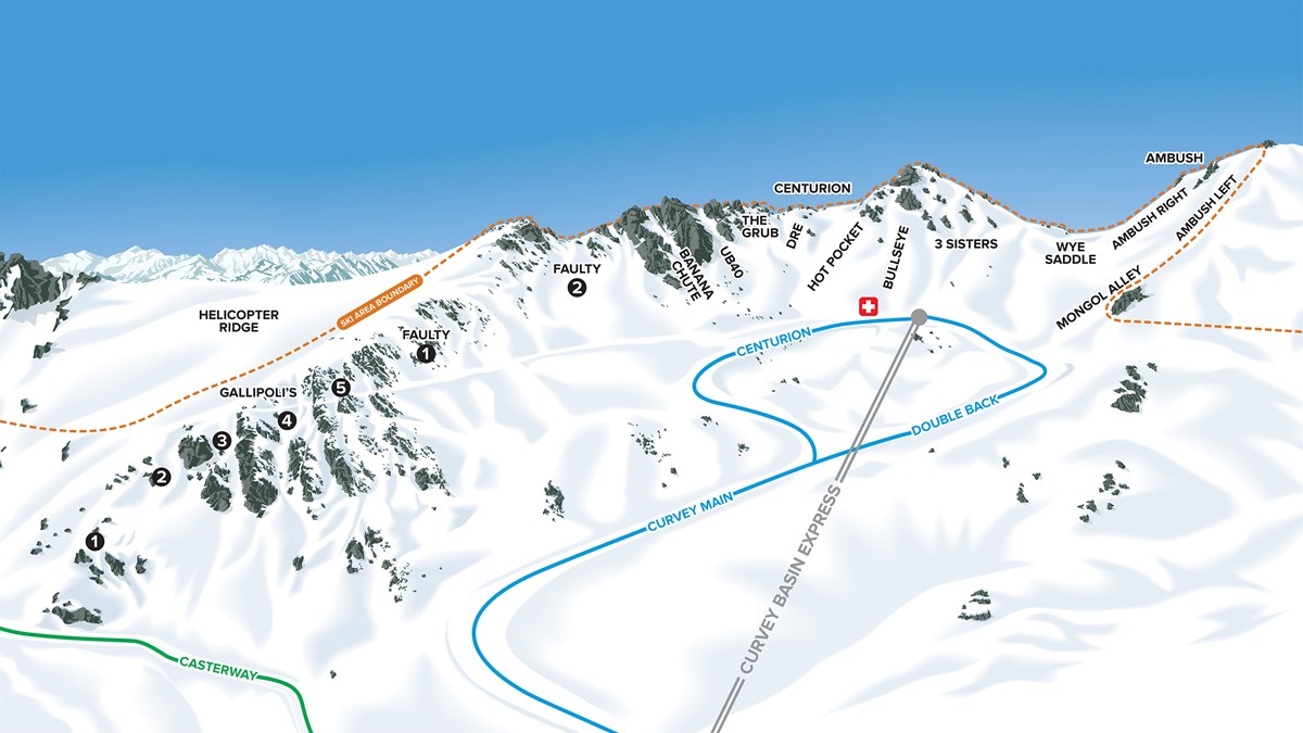 Straight through the Curvey Headwall runs a manmade crossing that takes you to the Gallipoli Chutes, no hiking or climbing necessary.