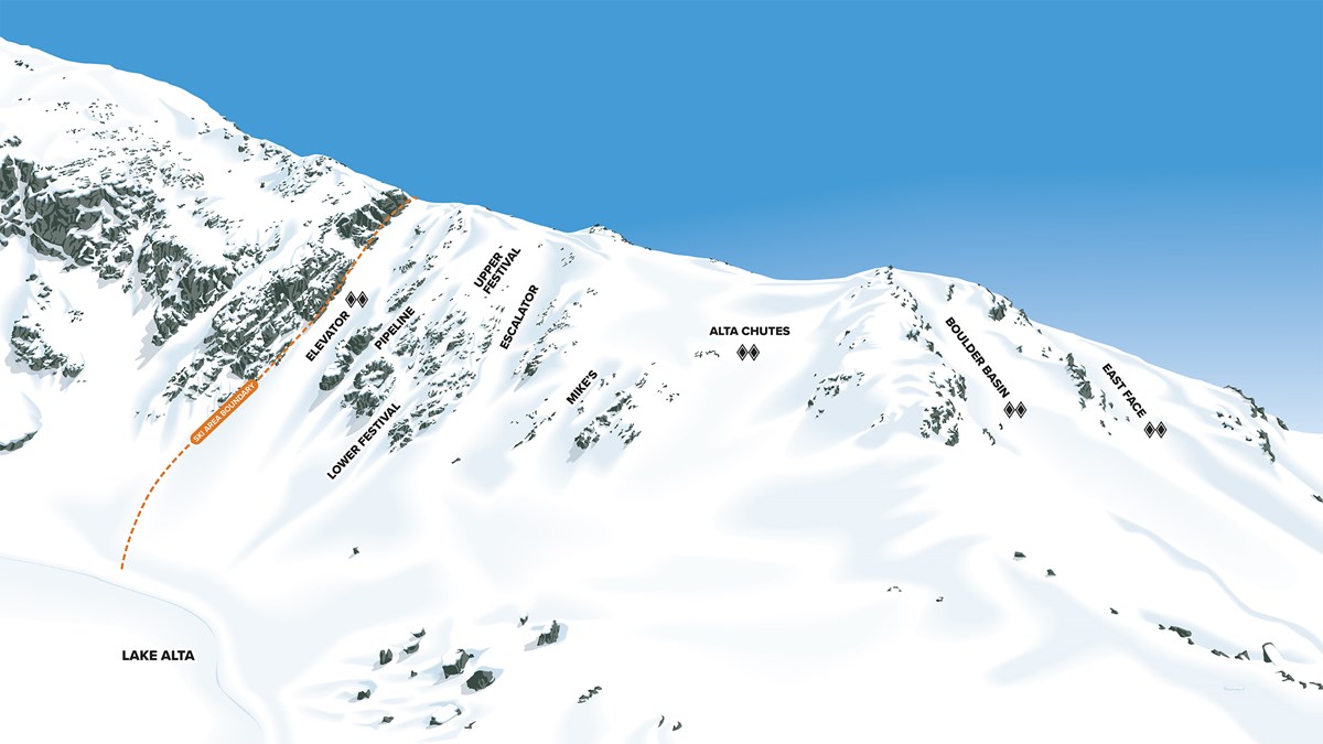 An uphill hike to your left will take you to the famous Alta Chutes, named after the stunning accompanying lake. The Elevator and Escalator in that section are great for steep and exposed skiing and lead you to another epic freeride zone, called East Knoll. This area includes Boulder Basin, East Face, The Nose and Front Face.